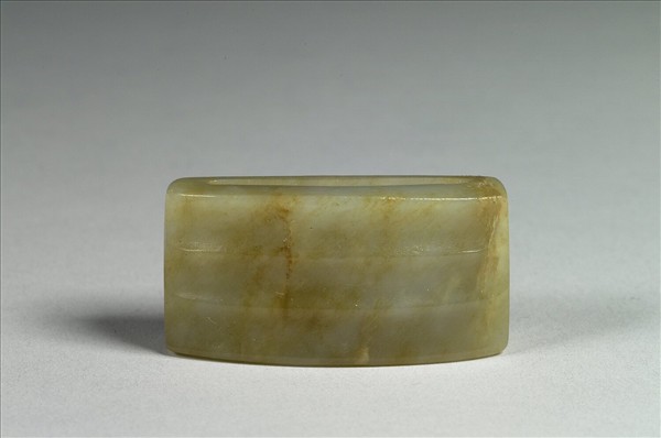 青白泛黃色玉,帶淺褐斑。玉璏原為戰國至漢代劍鞘上的嵌飾,因有長槽可將腰帶穿繫過去,固可將劍鞘固定在腰帶上。此件玉璏呈長方形,正面略作弧形,琢弦紋兩道。下端有一扁方形穿帶孔。