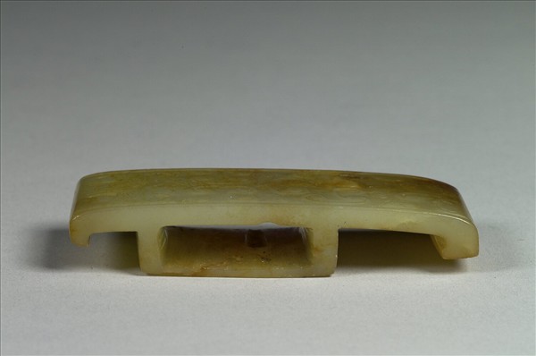 玉質,略呈褐色。下方可見具有獸眼及雙眉的獸面(劍璏實際使用時獸面應朝上),由下至上則以重複的紋飾單元鋪列器身,勾勒出簡化的獸身背脊,這是西漢中期至東漢常見的紋飾設計模式。劍璏由其平整底面和劍鞘貼合綁縛,同玉劍首、玉劍鐔(劍格)及玉劍摽(劍珌)為玉具劍完整的組件之一,是彰顯貴族身分地位的禮儀用具。