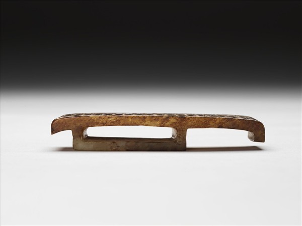 玉質,有大片赭斑。面琢乳丁紋。玉璏原為漢代劍鞘上的飾件,全器呈長方板形,板面略平,其兩端向內卷,下端有一方形穿帶孔。器表雕勾連雲紋,紋圓形小粒排列整齊。