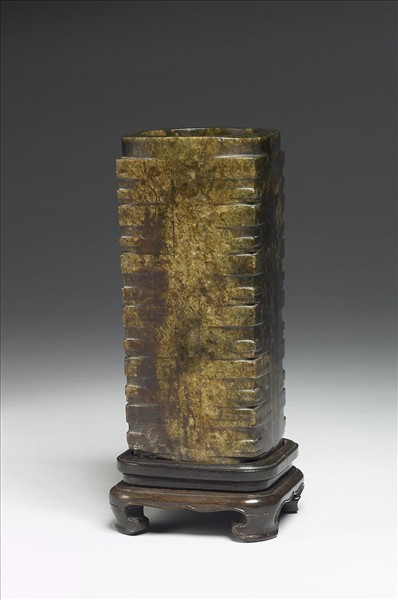 從考古資料可知,發展約千年的良渚文化可分早晚二期,其間最大的改變就是原本套在手腕或手臂上的玉方鐲,突然蛻變成高方、厚重、孔小、紋簡,無法套戴于腕的玉器。一些與天象有關的符號,只刻在圓璧與這種方柱形玉器上。強烈顯示後者就是「玉琮」,二者應是成組祭祀天地的禮器。此件為清宮舊藏,全器琢成六節雙圈帶短眼角的小眼面紋,短橫稜雕方轉的回紋以示鼻頭。可能在明晚期至清代被染成深褐色,清宮配製銅膽木座,用作花插。