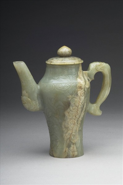 玉質,帶淺黃斑。器身作長圓形,附花苞蓋,前流後鋬、鼓腹、平底。腹琢以靈芝及花葉等紋,鋬首琢獸首紋,蓋飾靈芝紋。