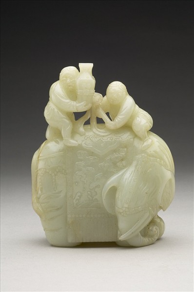 玉質,微有黃斑。全器立雕臥象,象首回顧,首、尾兩端各飾瓔珞紋,象背搭以琢有雲紋長帔,背上坐二孩童,一人坐於背上,手持如意,一人跪於背上,手捧一花瓶,寓「太平有象」。