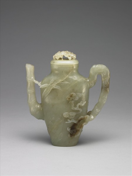 玉質。器身略扁,長流曲鋬,流作竹節狀,以松幹作鋬,附鈕蓋。蓋鈕鏤琢花葉,腹琢松、竹、梅。