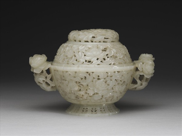 器身圓形,侈口,深壁,矮圈足。浮雕鏤空牡丹雙耳,蓋、器通體均滿鏤空透雕牡丹。玉質瑩白含青,形制精美,用盛鮮花,使滿室生香。