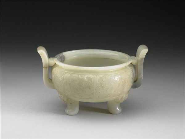 玉質,局部有片狀灰斑。器作青銅鼎形,圓腹、立耳、三足。三足上方浮雕獸首。腹部飾獸面紋,由兩兩相背的夔龍組成。