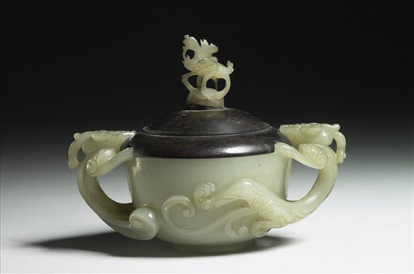 玉質,玉色微黃。弧形壁,有圈足。外壁有立雕二龍形耳,獸首啣於碗沿,獸身攀爬於外壁上。附玉頂木蓋。