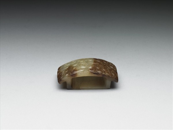 玉質,局部淺赭,器身有璺,面飾雲紋,一端作獸首。