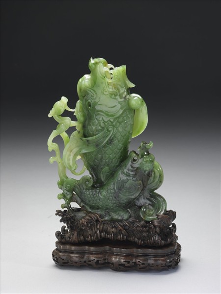 玉質晶瑩,色呈深綠。雕成子母鰲魚,自水中躍出,此造型有「魚躍龍門」的吉祥寓意。口下鐫篆書「乾隆年製」四字款。配有木座。