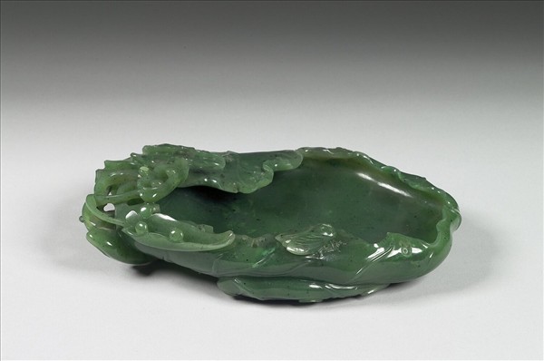 碧玉,全器作桐葉形,葉上有蟲蛀痕,側附一蟬。