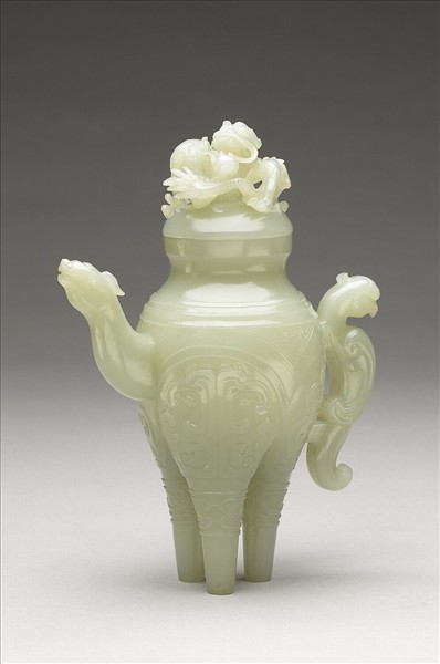 玉質。造形仿自商周青銅酒器「盉」。長頸獸形流、回首鳥形鋬、圓腹接聯襠式底,加上蟠龍的頂蓋,具有濃厚的裝飾性。口沿外側陰刻單行隸款「大清乾隆仿古」。