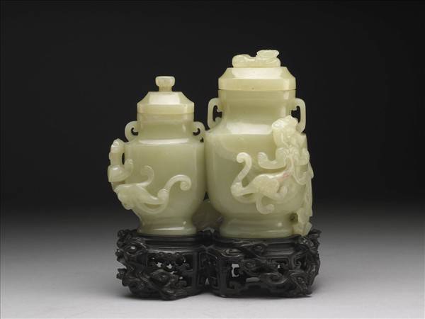 玉質,黃色,背面有一塊赭斑。雕兩瓶相連,一大一小,均附蓋。腹浮雕三螭及一鳳,螭正面攀附於瓶,鳳則呈現側面站立的姿態,大瓶的蓋鈕為一隻異獸。於清宮中配有一木座。