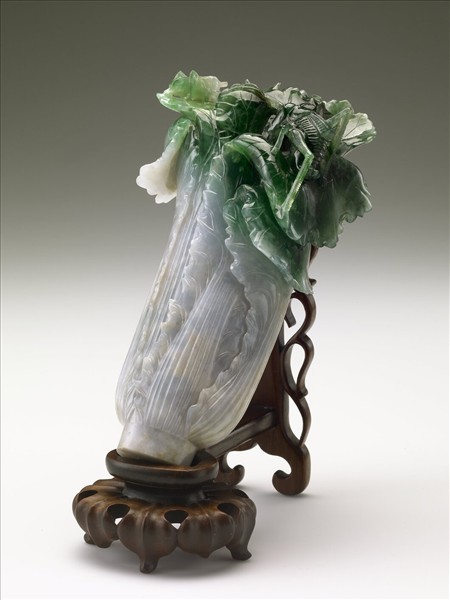 翠玉白菜是國立故宮博物院最受喜愛的藏品之一。工匠順應翠玉天然的色澤,以濃重的深綠色表現層層包覆的菜葉;白色部分雖有裂痕及雜質,但在巧妙的安排下,轉化為新鮮、飽含水分的白菜莖部。菜葉頂端的蟈蟈和蝗蟲,瞬間帶進了鮮活的田園氣息。翠玉白菜最初是一件華麗的宮殿陳設盆景,以栽種的形式立在琺瑯盆景上。