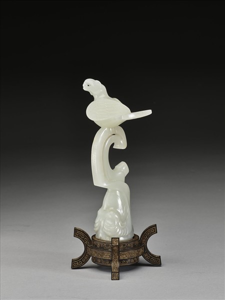 玉質。以《西清古鑑》卷38頁25「漢鳩首杖頭」為藍本。器分三層:底層為一羊首;中層為一中空之C形,類似《西清古鑑》所載之「舞戚」;上層為一鳩鳥。鳩鳥口中銜珠,鳥羽琢碾細膩,纖毫不茍。舞戚部位陰刻楷書乾隆三十九年(1774)御製詩:「鑄銅及削玉,鳩首杖頭為。養老漢朝製,貢珍西域馳。因他食葚譬,啟我教民思。設曰資扶策,將留待異時。」署「乾隆甲午仲春御題」及「古香」、「太璞」二印。附填金木座,底刻御製詩。