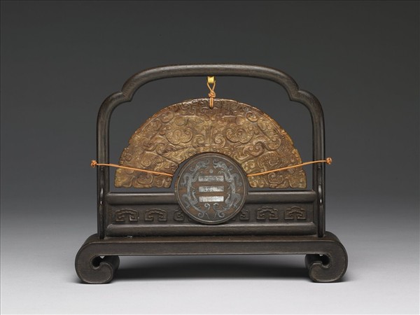 兩面正中為獸面紋,兩端作龍首。紋飾極精。帶木座。