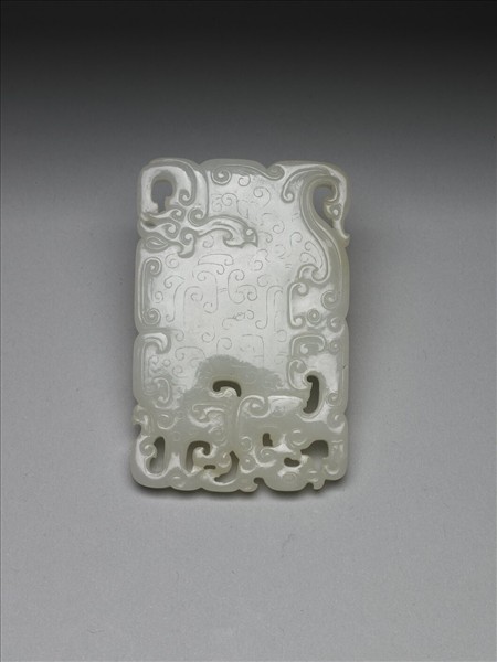 玉質,長方形片狀,一組成對。雙面同紋,鏤刻龍紋,並以淺陰線刻琢雲紋。