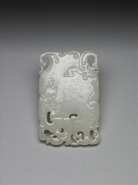 玉質,長方形片狀,一組成對。雙面同紋,鏤刻龍紋,並以淺陰線刻琢雲紋。