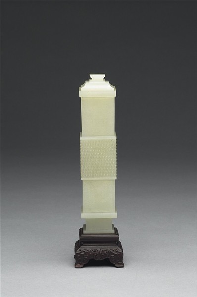 方瓶,如筒狀,口沿及近底各有一個凸起,中央飾乳丁紋,附蓋、木座,儲於湖綠織花錦匣內。