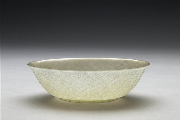 玉質,琢作圓碗,撇口,圈足。碗身外壁滿布四瓣花形開窗,開窗內琢圖案化四瓣花,開窗隙地琢六瓣花,花瓣均帶淺淺磨凹。底緣飾一圈橫向「入」形紋。圈足內滿雕重瓣花朵圖案,花瓣帶橢圓凹窩。
