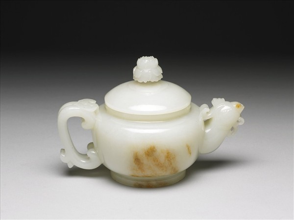 玉琢製,表面光素無紋,壺嘴立雕成鳳首,雕如意彎把,壺蓋鈕立雕盛開牡丹一朵。圈足內有「嘉慶御用」隸書刻款。鳳、牡丹與如意象徵吉祥富貴如意,光素的壺身,傳遞白玉溫潤的質感。此壺為存世罕見嘉慶御用款器,線條簡單,造型穩重。嘉慶御製詩集多有烹茶品茗詩,或可說明嘉慶皇帝,對品茗器類的重視。