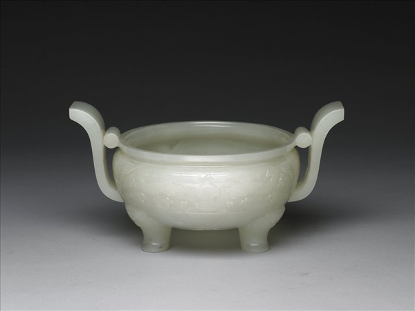 玉質,器身有璺。盤口、深腹、立耳、蹄足。腹飾幾何化獸面紋,下連飾帶穿過足至器底。