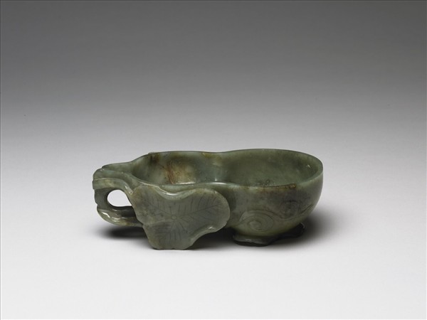 碧玉,全器以葫蘆為形,一側有浮雕枝葉為柄。