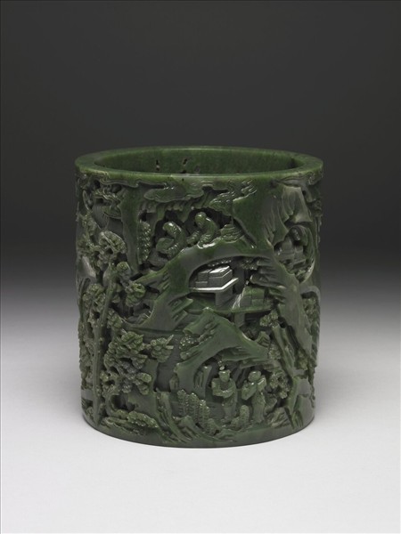 碧玉質。器外壁多層次浮雕文士與數童子理弄書籍於山壁石洞間。岩上鐫「石室藏書」四隸字。口沿陰刻楷體清高宗五十九年(1794)御製詩一首:「纖巧由來素不容,玉人述古漸知宗。圖成二酉藏書處,辰漢和闐縮地逢。」末署「乾隆甲寅夏御題」及「八徵耄念」印一。