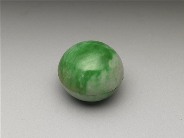 翠玉質。圓盒,器蓋與器身幾乎等大,皆呈圓罩形,光素無紋。此盒與另一大玉盒,共同收儲在一個雙桃形金盒內,金盒底刻「光緒十年(1884)三月 日義和 足金二兩 平重十三兩一錢」。