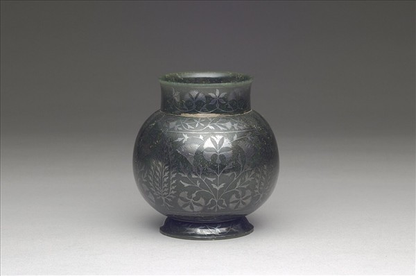 深碧綠玉,雕一直口、碩腹、圈足的小罐。器表滿佈以銀絲、銀片表現的石竹等花葉紋,是典型的印度工藝。