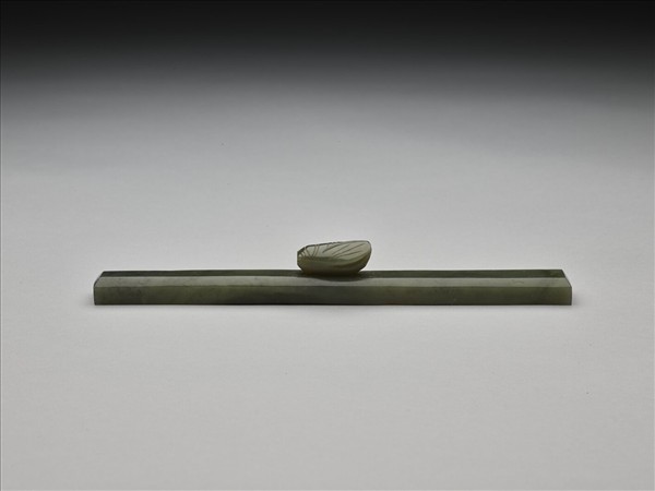 碧玉質梯形案,案面為長方形,中央琢一蟬鈕。