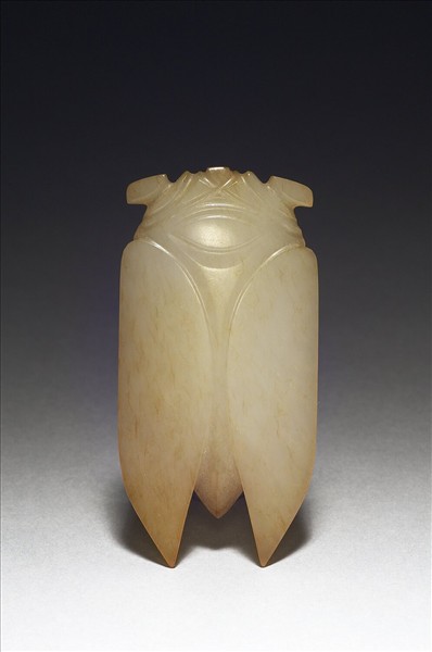 玉質,雜赭斑。器薄呈蟬形,造型幾何化,頂有一牛鼻穿。