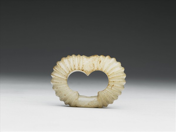 玉質,器橢圓,內中空。一面飾連續凸棱。