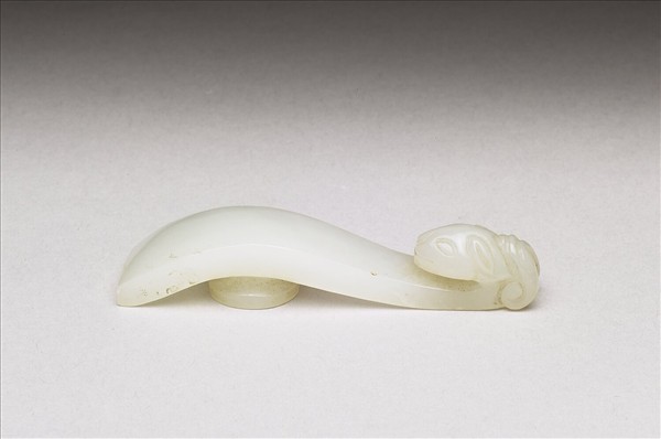 玉質,色瑩白光潤。側視為S形,一端雕獸首,獸頸曲折以為鉤,背面有髮,另一端弧凸,背雕一柱以繫腰帶。