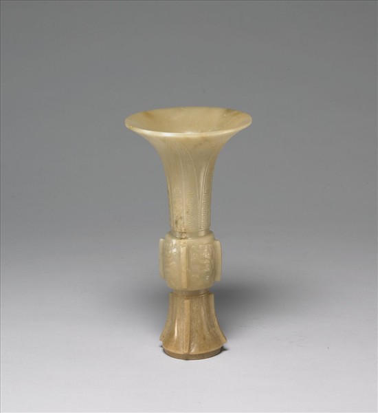 玉質,玉色灰黃,足部色較深。器仿青銅器觚形,撇口,長頸,圈足。器分三段,上下飾焦葉紋,中段琢獸面紋,中、下段各飾四個凸棱。附紫檀木座。