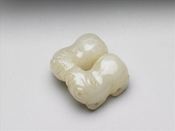 玉質,色白而光潤。作立雕趴伏小獸二隻,小獸比肩同臥,以口唇及臀腹相連結。伏身翹臀,身體線條雕琢簡單。側邊有二橫孔分自小獸外側足部貫穿,應作為嵌飾他物之用。