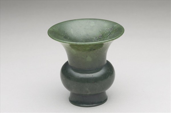 碧⽟質,有綹。撇⼝,⻑頸,窄肩,深壁,腹部豐碩,矮圈⾜,圈⾜外撇。全 器光素無紋。底刻「嘉慶年製」四字隸款。