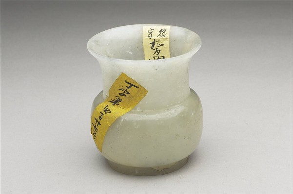 青白玉質,有白斑,有綹有璺。撇口,長頸,窄肩,深壁,碩腹,矮圈足。全器光素無紋。底刻「嘉慶年製」四字隸款。
