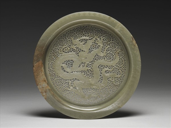 玉質,器緣有褐黃斑塊。圓盤正面飾行龍紋,尖吻,長角,角根處琢一排圓珠,豐鬣,細頸,身軀似飄帶般彎曲翻轉,平面起伏有致,全身滿覆細鱗,鱗上並陰刻細線紋,四肢肌理飽滿,足有三趾,趾甲尖鉤如鐮刀般鋒銳。間隙填以鏤空卷草紋錦地,層次略低於龍紋。背面的紋飾一如正面,除了龍的鬚鬣較粗、鱗片上無細紋外,其他細節均無簡省。就紋樣而言,如此雄強矯健的龍紋,與〈北宋真宗禪地玉冊〉所附玉匱上之嵌片的龍紋相比,兩者近似,而風格更像遼代陳國公主墓出土的一件金花銀奩上者,只是此玉盤龍紋的細,與本院藏宋代花間行龍紋的緙絲作品差可比擬,故推斷此盤應屬11世紀上半,遼或北宋的作品。