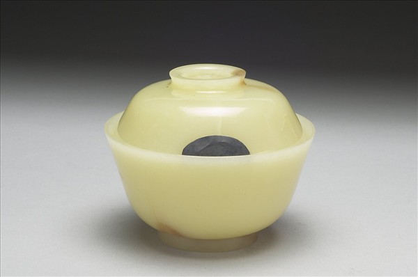 玉質,局部呈褐色。碗,深壁,圈足,帶蓋,圈形鈕。全器光素無紋。此器應為實用的飲器。器蓋邊緣有傷缺,以鐵皮包合。