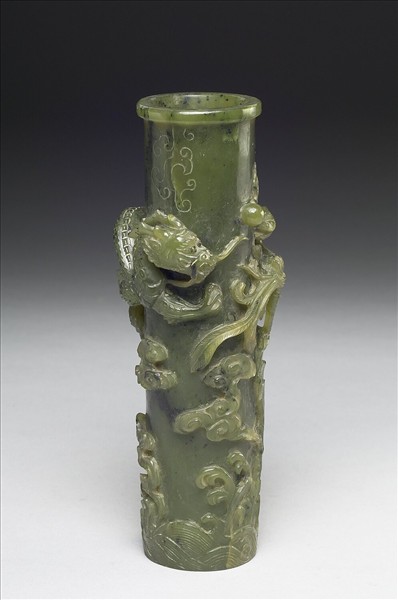 碧玉,帶深綠斑。圓筒形,外壁浮雕龍鳳及火珠紋,下方有壽山福海及如意雲紋。