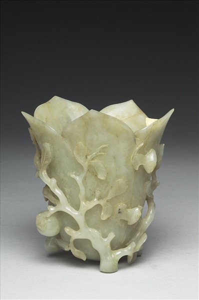 青玉質,雜白綹,微沁赭色。全器雕花朵狀,中心挖空作容器。外壁浮雕柿子、如意、蝙蝠裝飾,有吉祥寓意。