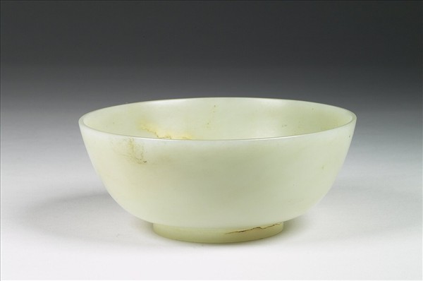 玉質,器內璧及圈足有璺。口微侈、弧壁、圈足,全器光素無紋,器內有使用遺痕。