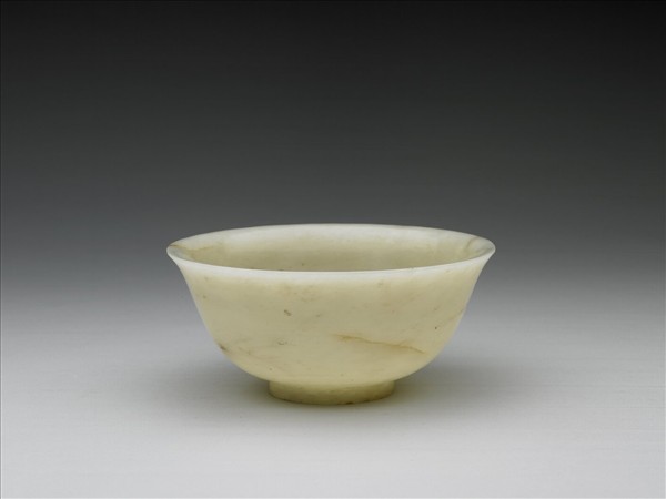 玉質,器身有瑕,微帶灰白及褐色斑紋。撇口、弧壁、圈足。外底心陰刻「大清乾隆年製」六字篆款。