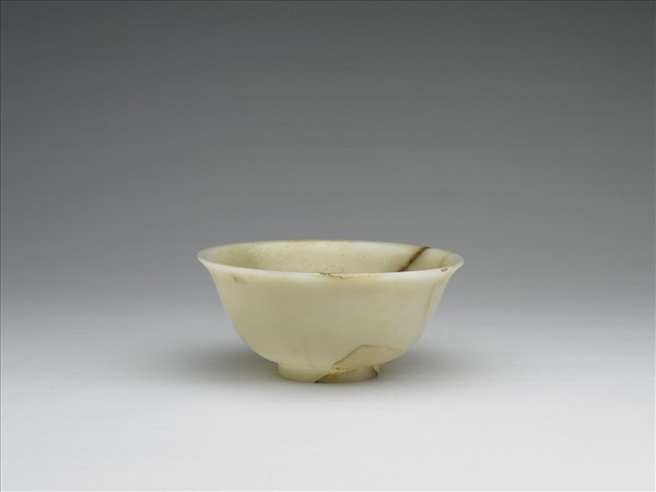 玉質,帶赭褐斑紋,器身及圈足有璺。撇口、弧壁、圈足。外底心陰刻「大清乾隆年製」六字篆款。