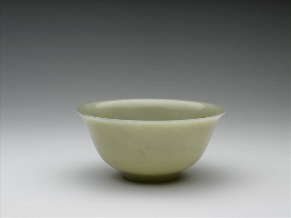 玉質,帶赭墨斑紋,並帶白色瑕紋。撇口、弧壁、圈足。外底心陰刻「大清乾隆年製」六字篆款。
