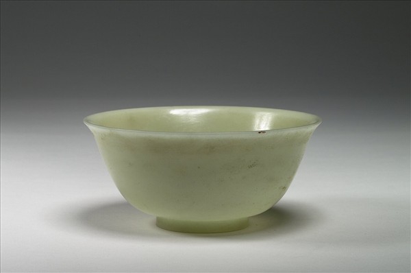 玉質,瑩潤無紋。撇口、弧壁、圈足。外底心陰刻「大清乾隆年製」六字篆款。