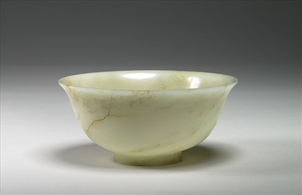 玉質,有瑕有璺,帶赭斑紋。撇口、弧壁、圈足。外底心陰刻「大清乾隆年製」六字篆款。