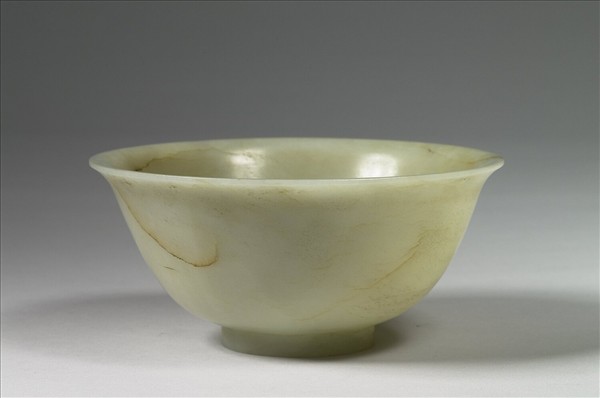 玉質,器身有璺、有瑕並呈褐黃色。撇口、弧壁、圈足。外底心陰刻「大清乾隆年製」六字篆款。