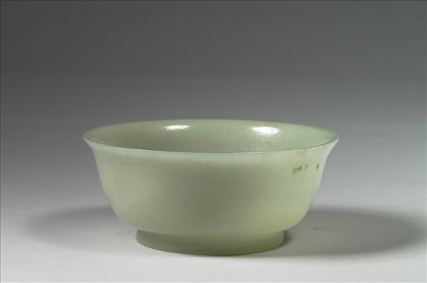玉質,帶赭斑。撇口、弧壁、圈足。外底心陰刻「大清乾隆年製」二行六字篆款。