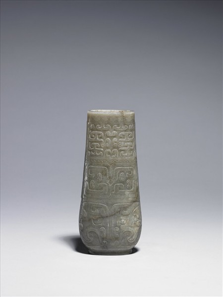 玉有璺。扁瓶形,平口,直壁,上小下大,有圈足。全器飾幾何化獸面紋,回紋及Z字紋於口沿、頸部、兩側。以淺陰刻和淺浮雕技法為主。