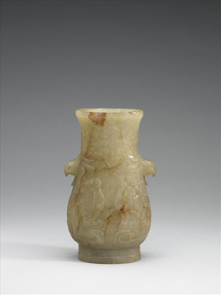 玉有赭斑。侈口,圓腹,高圈足。頸飾如意雲紋,兩鳥首自頸下兩側突出為耳,器腹浮雕鳥的身軀與羽翼紋。